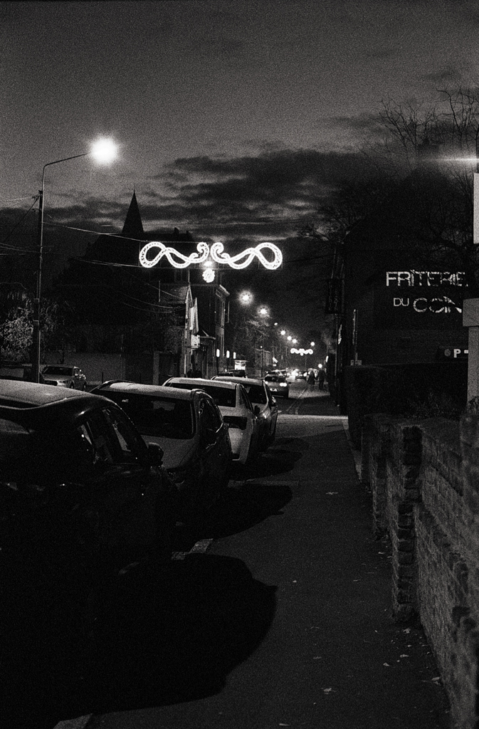 Je suis allé chercher ces images argentiques à quelques pas de chez moi. Ce sont les premières photos avec le Canon EOS 33 de JP et la Kodak TMX P3200. La sensibilité calée sur 1600 ISO, j’ai dû travailler avec une ouverture à F4 et une vitesse au 1/15 il me semble. On ne voyait pas grand chose, exactement ce que je voulais. Photographier en lumière basse, dans la rue ou en intérieur, est devenu un hobby. Les jours sont définitivement trop tristes en ce moment. La nuit est plus mystérieuse, plus graphique et plus intéressante en noir et blanc. Il y en aura d’autres.