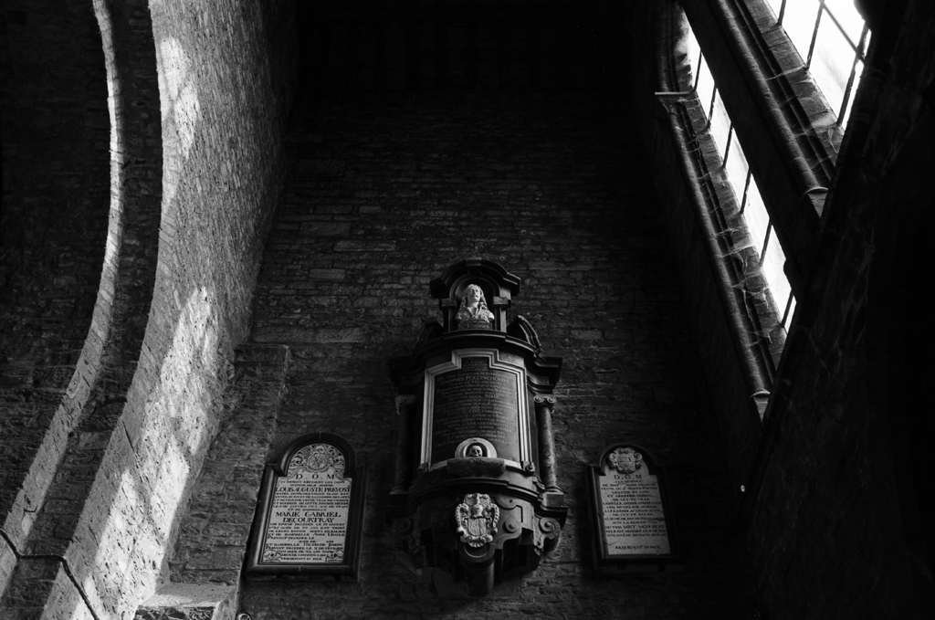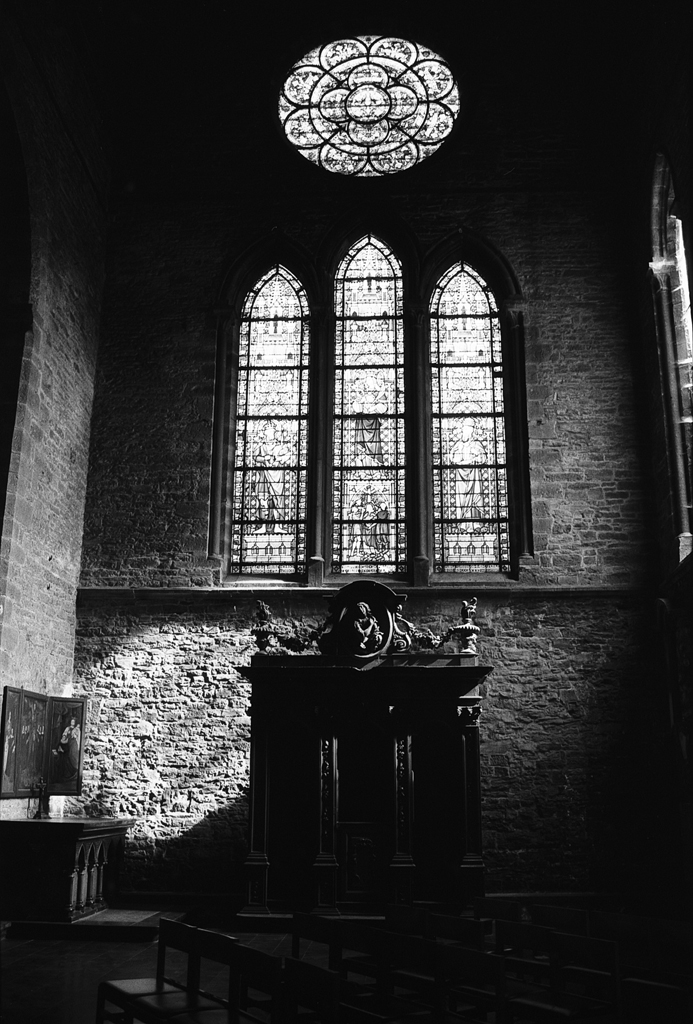 Tout le monde vous dira qu’il est nécessaire d’exposer à 1600 ISO minimum si vous voulez photographier à l’intérieur d’une église (À moins de venir avec un trépied ou un appareil stabilisé). Ce n’est pas faux. C’est d’ailleurs ce que je préconise aux photographes amateurs se lançant dans la photographie de mariage. Un objectif stabilisé ne sert à rien quand les mariés sont en mouvement. Dans cette église romane de Tournai, je n’ai pas suivi ce principe. Une pellicule de 100 ISO était installée dans le boîtier et je n’avais prévu de photographier à l’intérieur d’une église. Heureusement, le Nikkor 35mm F1.8 G était monté sur le Nikon F100. Sans cet objectif lumineux, la prise de vue à main levée aurait été délicate. En ouvrant entre F1,8 et F2,2, je pouvais opérer au 1/30, une vitesse suffisante pour éviter le flou de bouger avec un reflex.